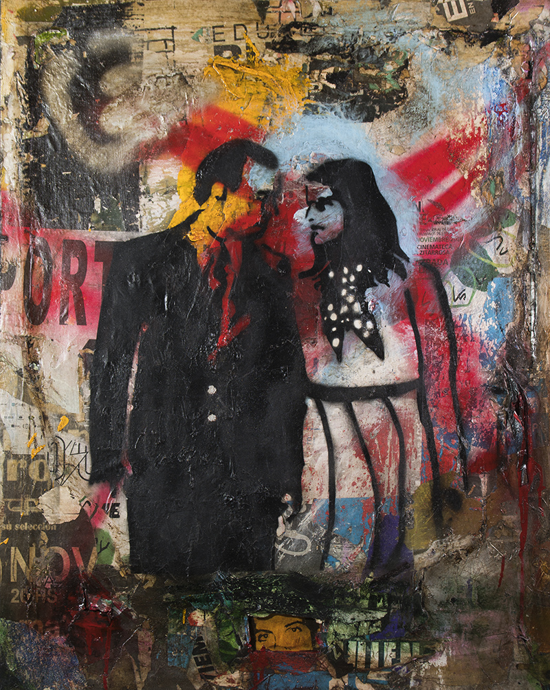 En mi reinterpretación de esta historia, trabajo el lienzo con la superposición de trozos de afiches de varios muros de Montevideo, restos de pintura, papel y finas capas de revoque arrancado con los afiches.