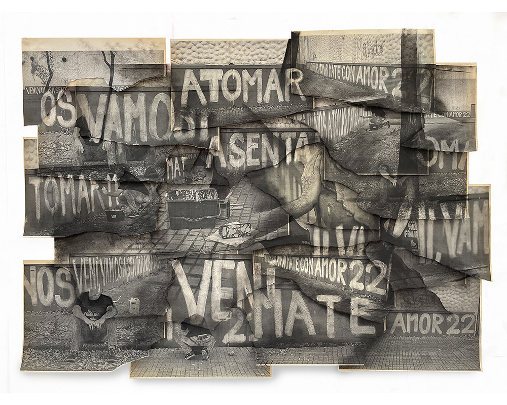 Descripción: Imagen compuesta por dibujo realizado con grafito, pigmentos y goma de borrar sobre impresiones del registro fotográfico de la acción realizada para el proyecto “Encontrarte Con Ellos” para homenajear a León ¨El Loco¨ Duarte, visto con vida por última vez el 13 de julio de 1976 en Automotores Orletti, Buenos Aires, Argentina. La acción consistió en una intervención urbana realizada el domingo 2 de mayo de 2021 a las 16 hs, cuando un militante y compañero de lucha (ROE) de “El Loco” Duarte pintó con pintura blanca sobre un muro de la calle Cuareim y Tajes una frase que “El loco” solía decir a su hijo Néstor los días de lluvia: “VENÍ, VAMOS A SENTARNOS A TOMAR MATE CON AMOR”. En el año 1973, en esa esquina, ese mismo compañero de Duarte de la ROE había pintado: “Solidaridad con los destituidos”, y por ese acto fue luego detenido por los milicos. En 1973 y en 2021 las dos frases fueron pintadas de forma clandestina, por la misma mano, en el mismo lugar del mismo muro y con igual ancho de brocha.
