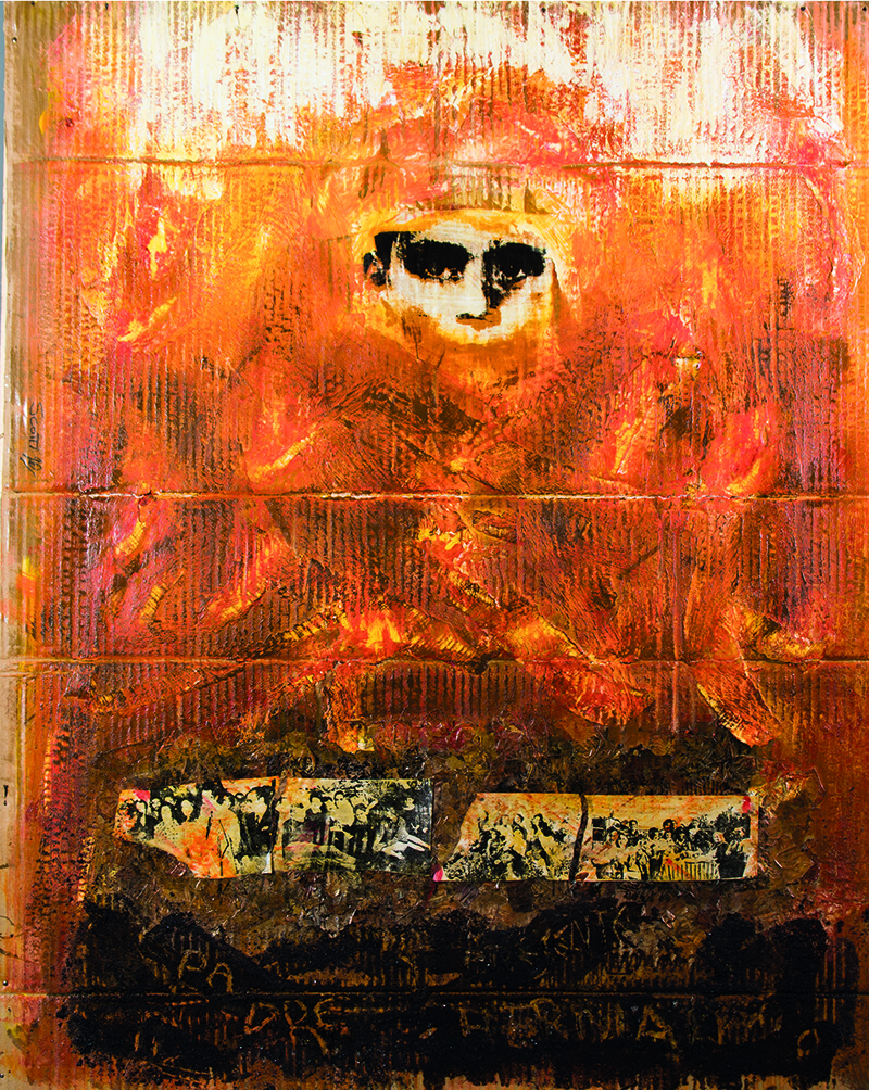 Técnica mixta, sobre cartón, serigrafía, collage, café, piel de cebolla, enduido… 80 x 100 (2021)