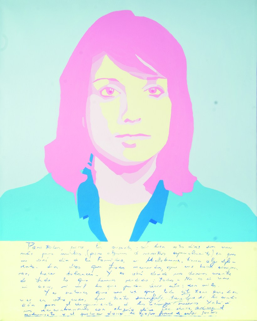 Retrato con un fondo abstracto como metáfora, se trata de un estampado de tela de los años 70’s compuesto por un patrón de cuatro cuadrantes iguales y diferentes como metáfora de los cuatro hijos que tuvo. Dos de sus hijos también están desaparecidos por eso el cuadrante se incorpora a su vestimenta cubriendo-siendo y estando en su pecho. El pecho de una madre sin sus hijos, y de sus hijos sin el pecho de su madre.
